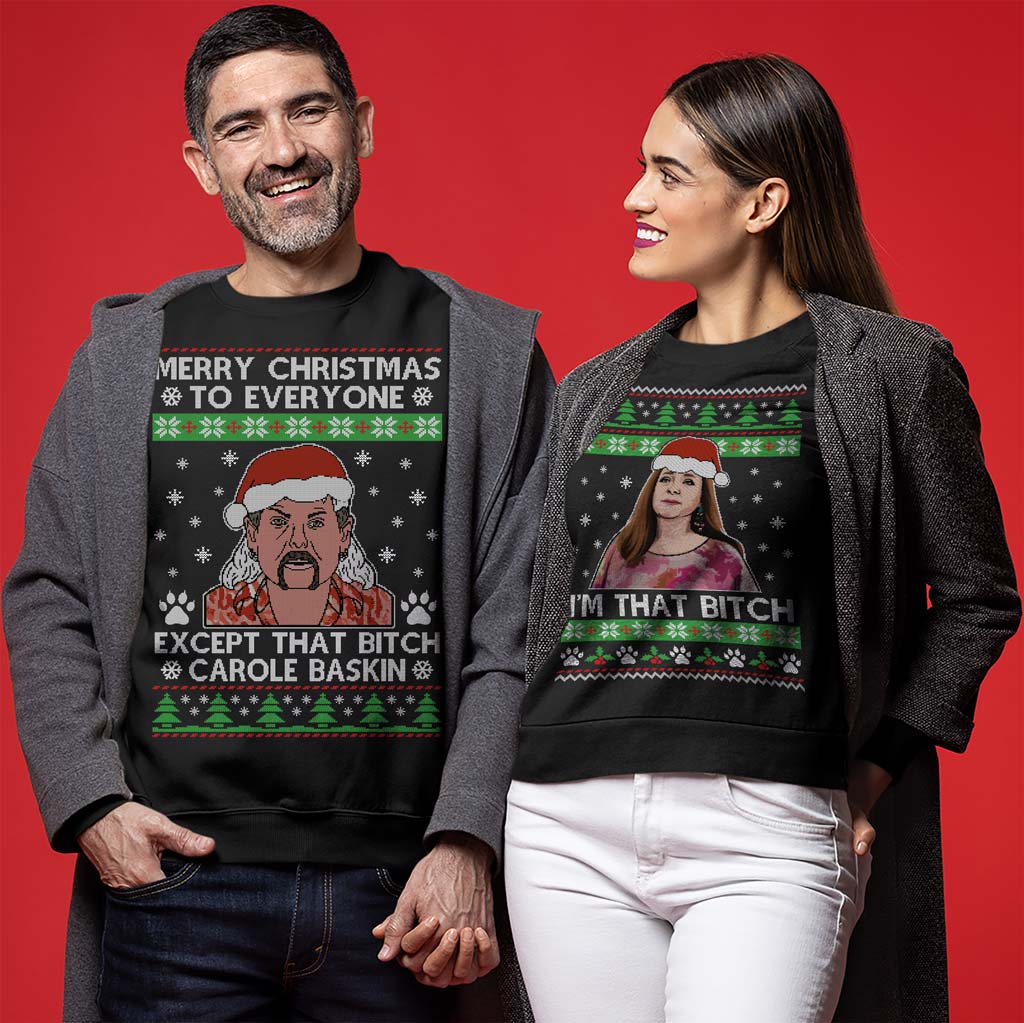 Carole Baskin Couples Ugly Christmas Sweaters is designed with a perfect blend of soft cotton and breathable polyester, this classic heavy-blend crewneck sweatshirt fits comfortably and is great for warm weather. The side seams are also stitched to prevent irritation.