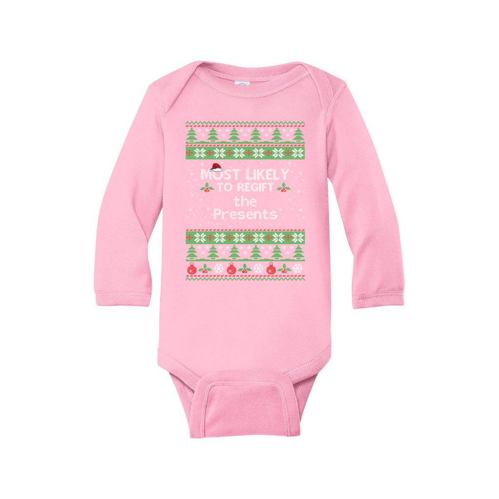 Enjoy the holiday season with perfect matching family ugly sweaters, and do not leave out the special ugly one for your Infant. Family Christmas Matching Sweaters For Baby Most Likely To Shape The Presents will get your baby into the holiday’s funny ugly spirit with adorable long-sleeve body suit, with snowmen, Santa, reindeer and candy canes. The ugly design for the Christmas sweaters will utterly bring a humorous look and vibe to family’s Christmas gatherings!