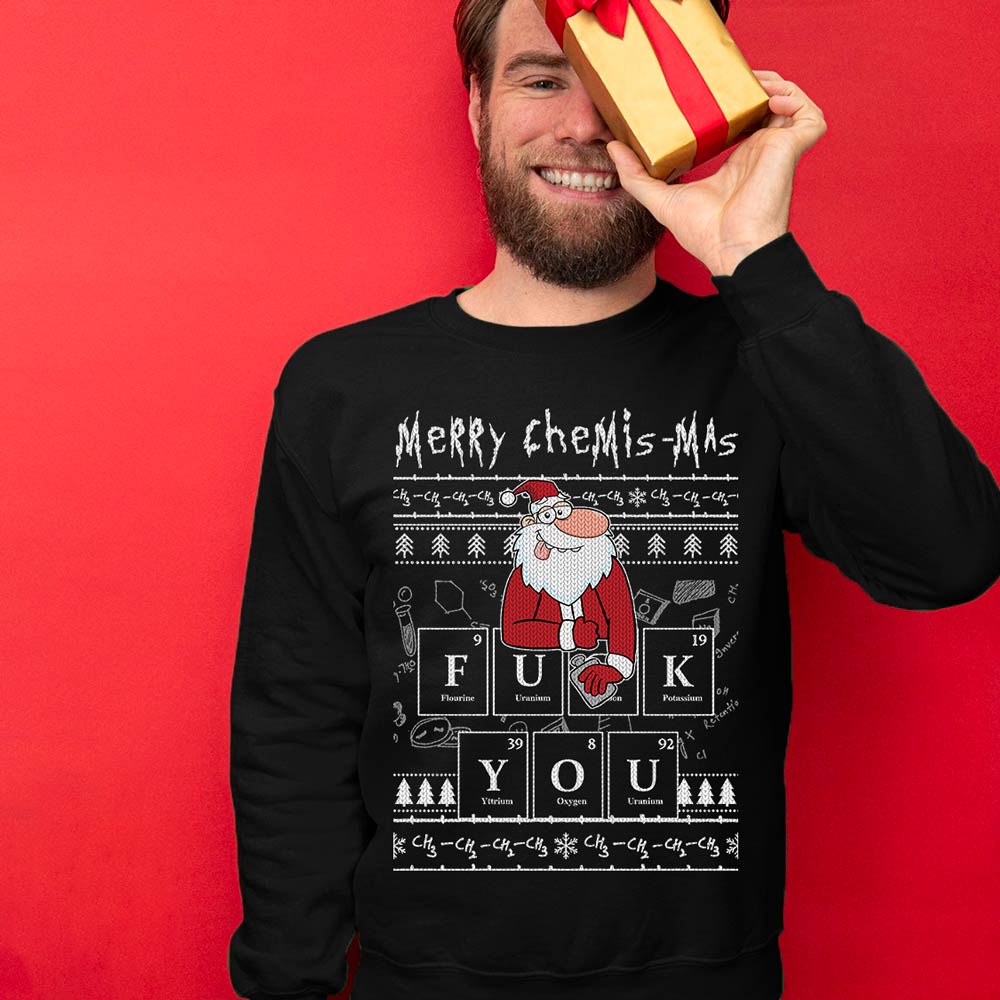 Merry Chemis-mas Chemistry Christmas Sweater is a must for Christmas parties and your holiday season memories. Finding the ideal ugly sweater that complements your style and personality is important, as you well know. For this reason, we carefully select a collection that ensures originality and comedy so you may proudly exhibit your holiday passion. Find ugly Christmas sweaters that will make you the center of attention at the gathering!