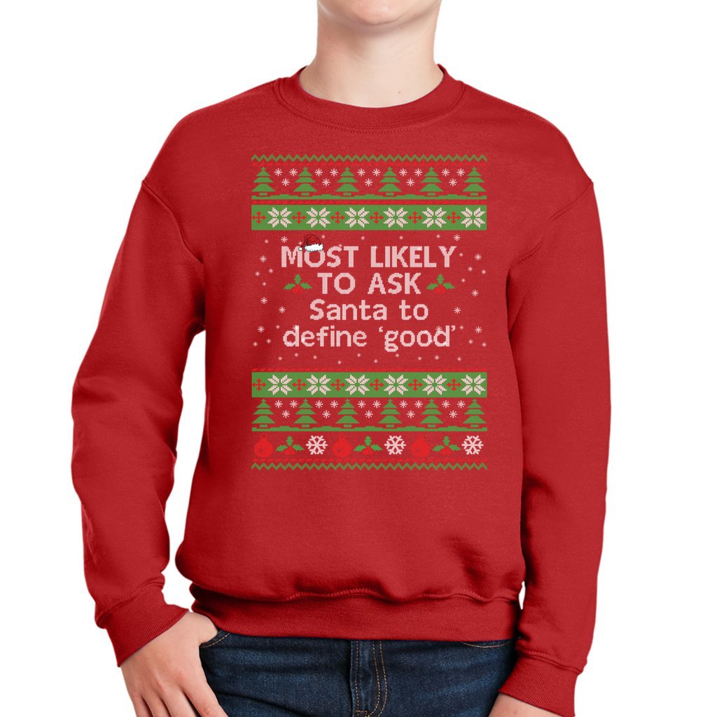 Not just hilarious for kids’ presents and family Christmas albums, these Christmas Ugly Sweaters For Kids Most Likely To Ask Santa To Define Good are of excellent comfort and quality that will make the qualified items for your kids’ sensibly vulnerable skin. Also designed with comfortable and soft fabric, classic crew neckline, with flattering unisex cut and just the perfect amount of elasticity makes these are incredibly comfy and cozy for all kids throughout the whole awesome active holiday. Noted for Christmas Ugly Sweaters For Kids Most Likely To Ask Santa To Define Good! These designs are available in various colors for different preferences and all shapes sizes for both big and little guys. So be free to pick up what would be the most suitable for your kids!