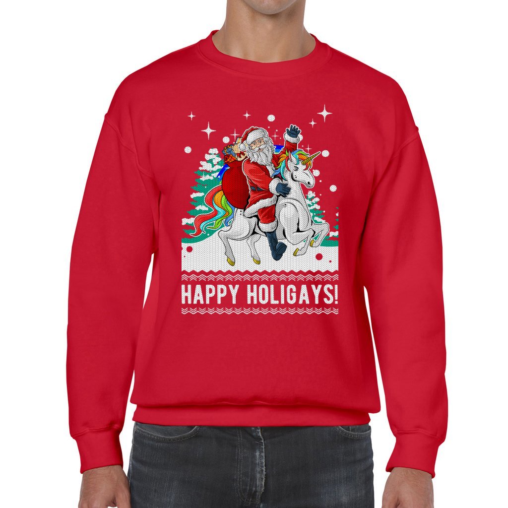 Funny Santa Happy Holigays Ugly Christmas Sweater is a must for Christmas parties and your holiday season memories. Finding the ideal ugly sweater that complements your style and personality is important, as you well know. For this reason, we carefully select a collection that ensures originality and comedy so you may proudly exhibit your holiday passion. Find ugly Christmas sweaters that will make you the center of attention at the gathering!