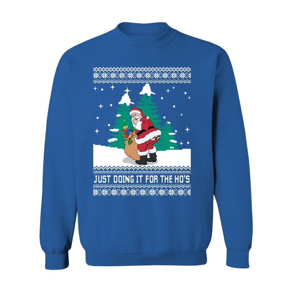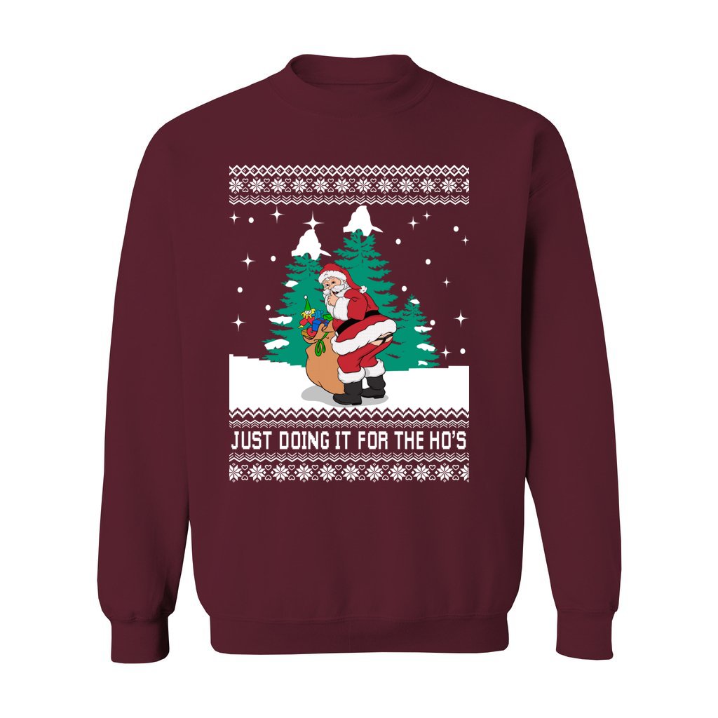 A wonderful holiday trend, ugly Christmas sweaters have transformed from fashion faux pas. Funny Santa Just Doing It For The Ho’s Women’s Ugly Sweater has eye-catching patterns, lighthearted themes, and brilliant colors that make people smile and leave them with enduring memories. All the characteristics that make these sweaters so adored are included in our Santa ugly Christmas sweater collection.