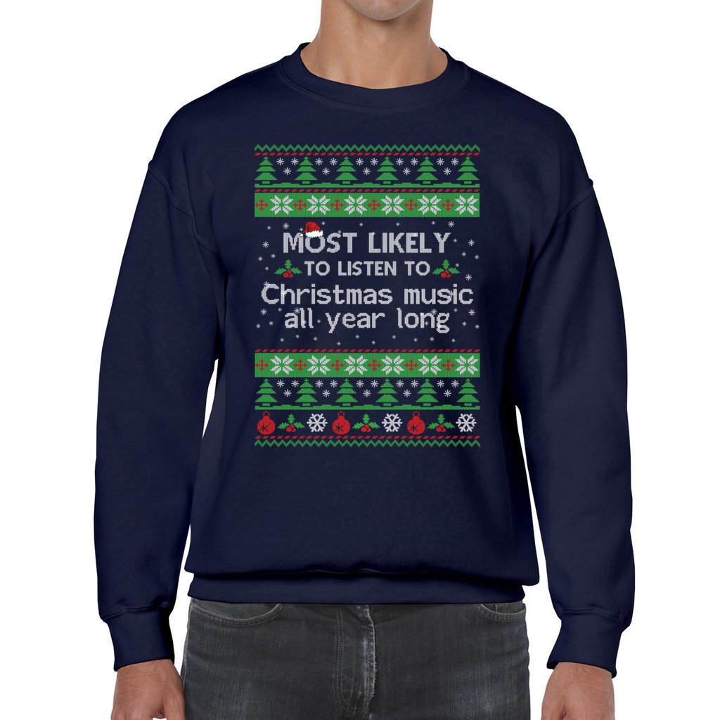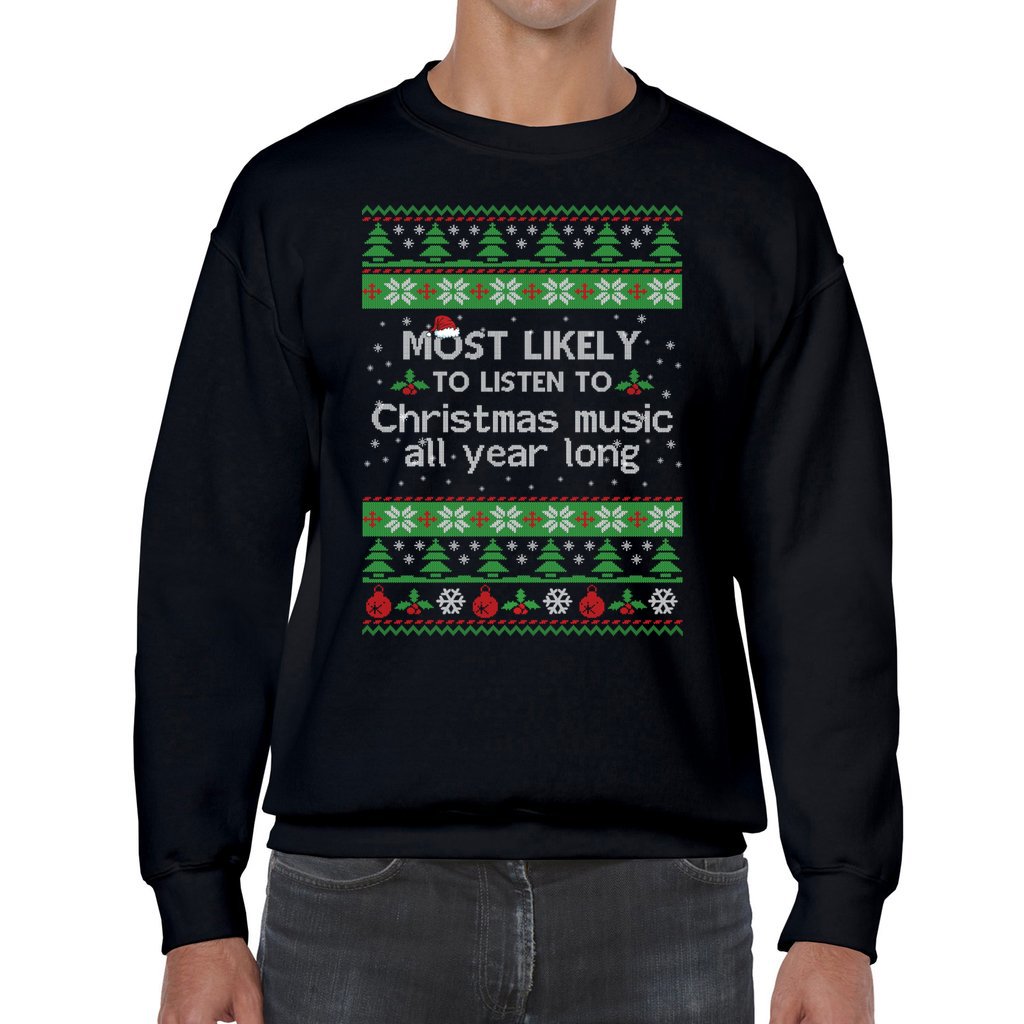 Most Likely To Listen To Christmas Music All Year Long Unisex Ugly Christmas Sweaters