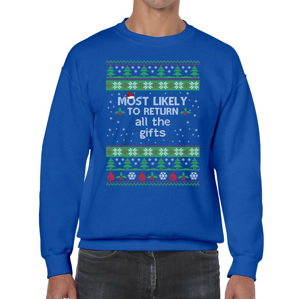 A Unisex Ugly Christmas sweater ironically can turn your holiday assembly from basic to adorable. In our uniquely designed, ultra-soft material, your holiday wear gets the boost it needs to bring the holiday cheer. Rest assured Most Likely To Return All The Gifts Matching Ugly Christmas Sweater is of the highest quality, easy care material to keep you warm and happy all season long.