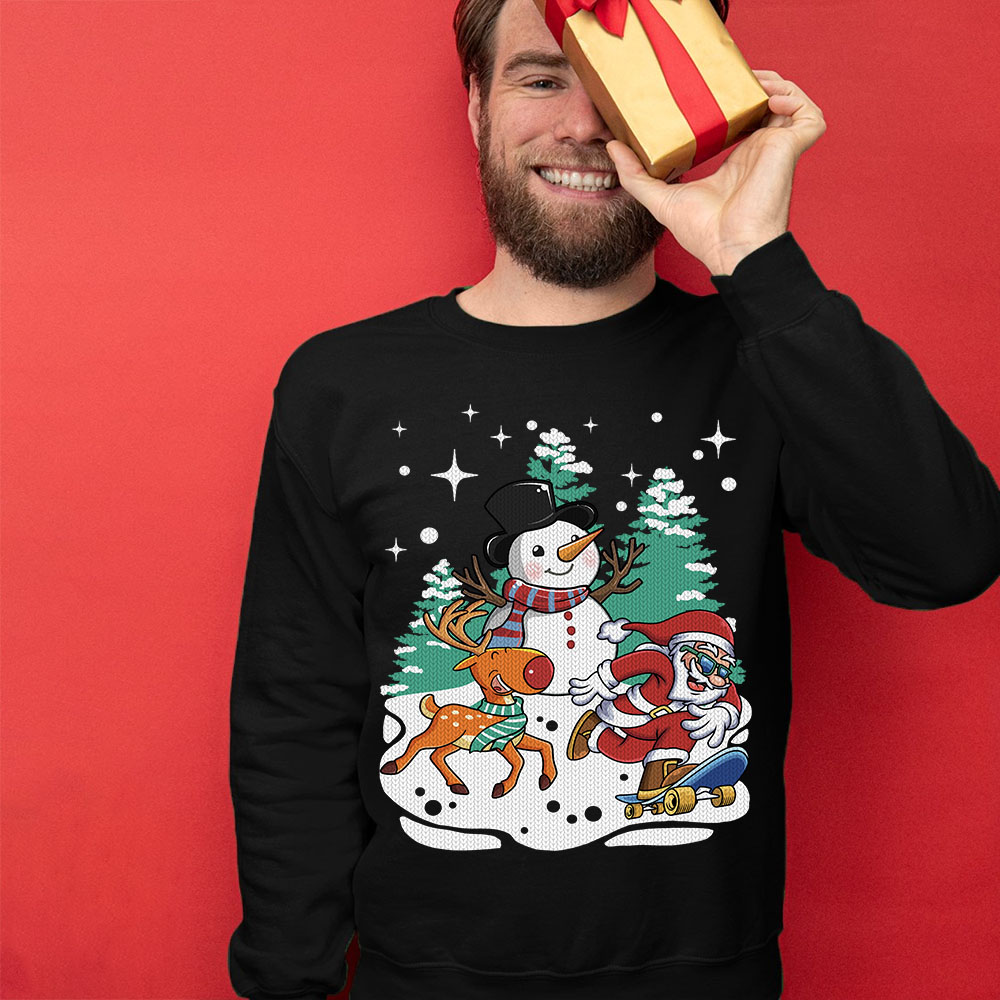 For those looking to add a little of comedy to their holiday attire, our comical Skateboarding Santa And Reindeer Ugly Sweater is the ideal option. These sweaters, which are bursting with amusing patterns and cheery charm, are sure to put a smile on everyone’s face. With these humorous Christmas-themed designs, you’ll be the center of attention at your upcoming ugly sweater party.