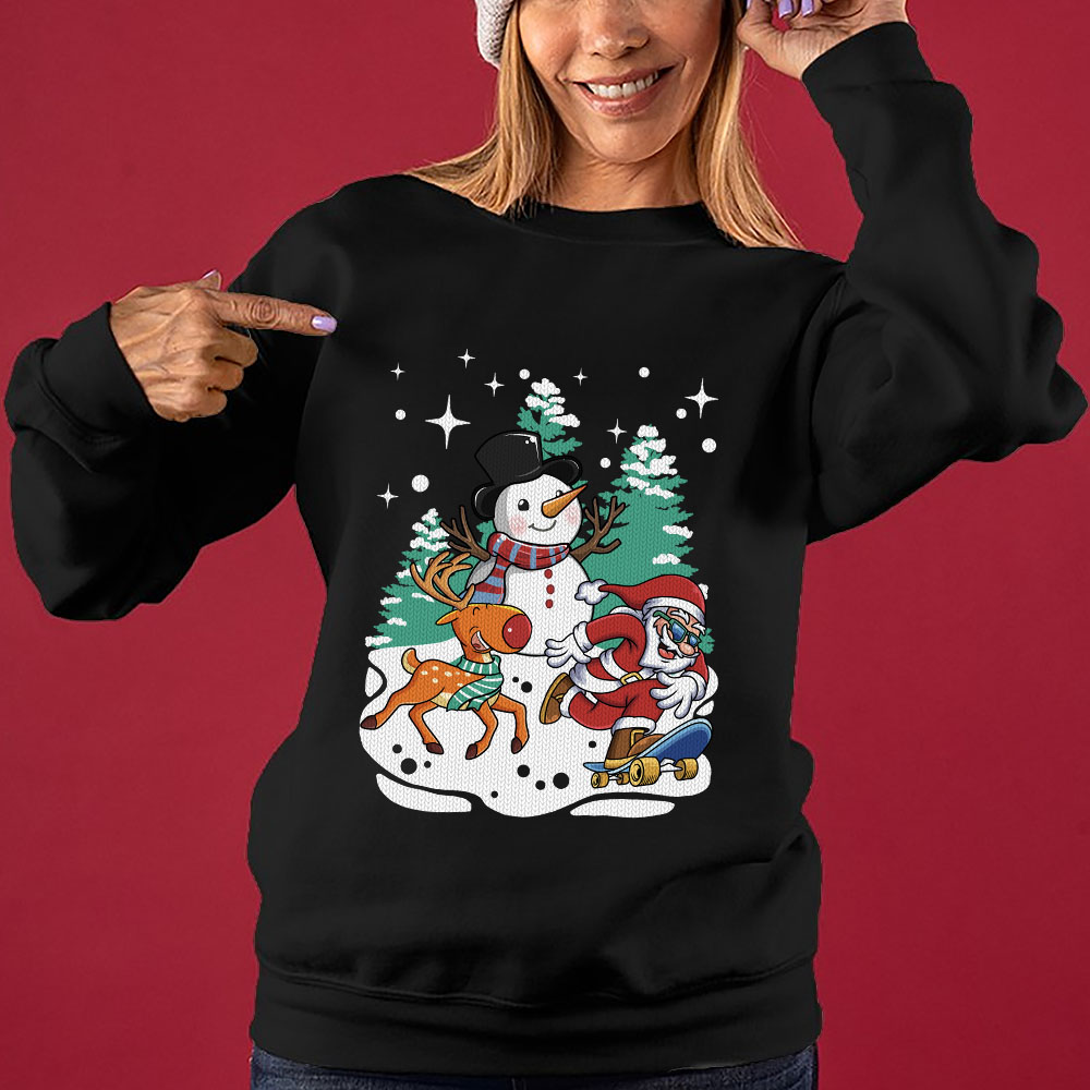 Our Skateboarding Santa And Reindeer Ugly Sweater are made with care from premium materials and offer both comfort and style. Stay cozy and warm while showcasing your love for all things festive. Santa Claus, reindeer, presents, and other festive symbols are all featured on each sweater, adding even more joy to your Christmas wardrobe.