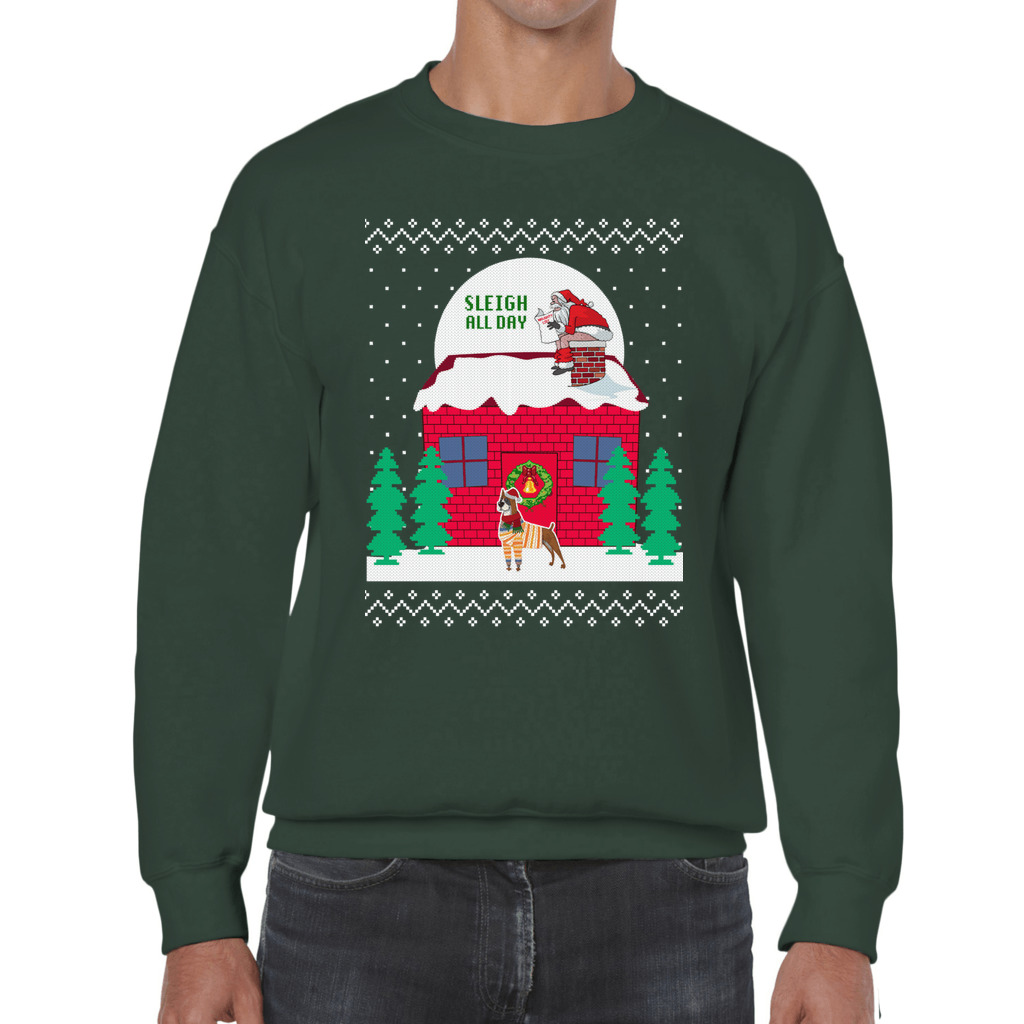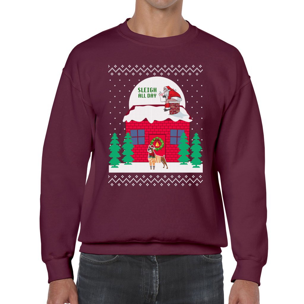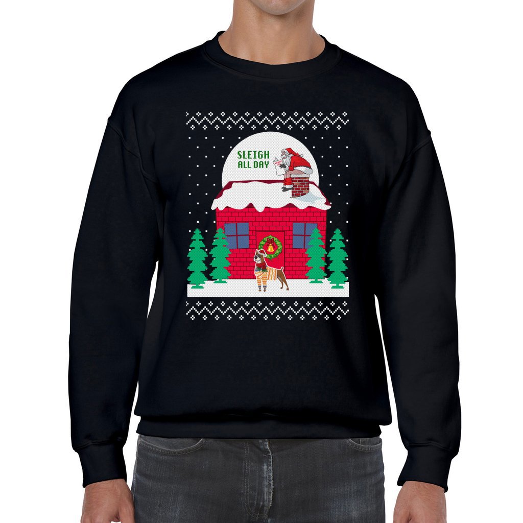 Comfortable and warm: We made each item with love and care, for comfort on your skin and warmth enough for you to show off your funny side just wearing this Sleigh All Day Santa Dog Men’s Ugly Christmas Sweater to parties. With crew-neck style,