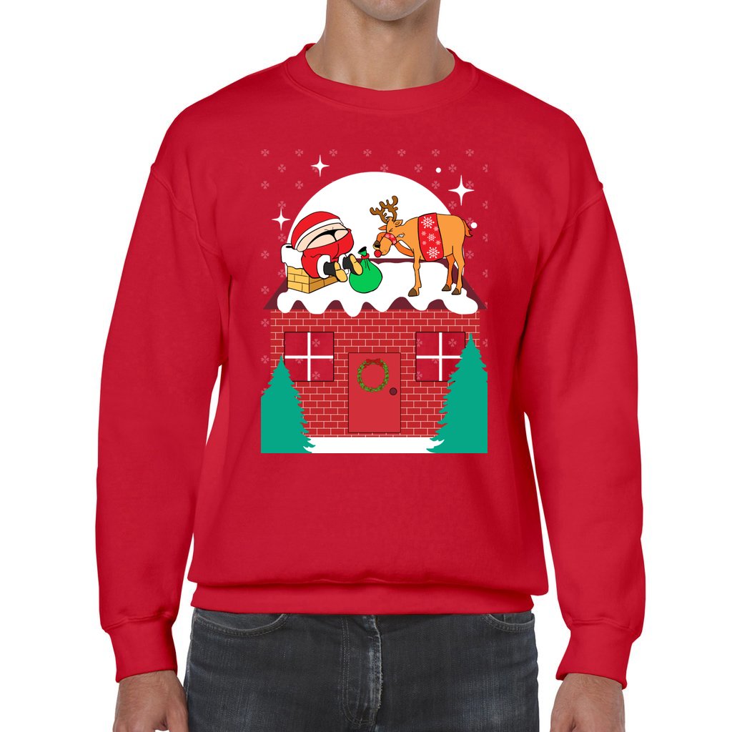 Comfortable and warm: We made each item with love and care, for comfort on your skin and warmth enough for you to show off your funny side just wearing this Stuck Santa Reindeer Ugly Christmas Sweater to parties. With crew-neck style,